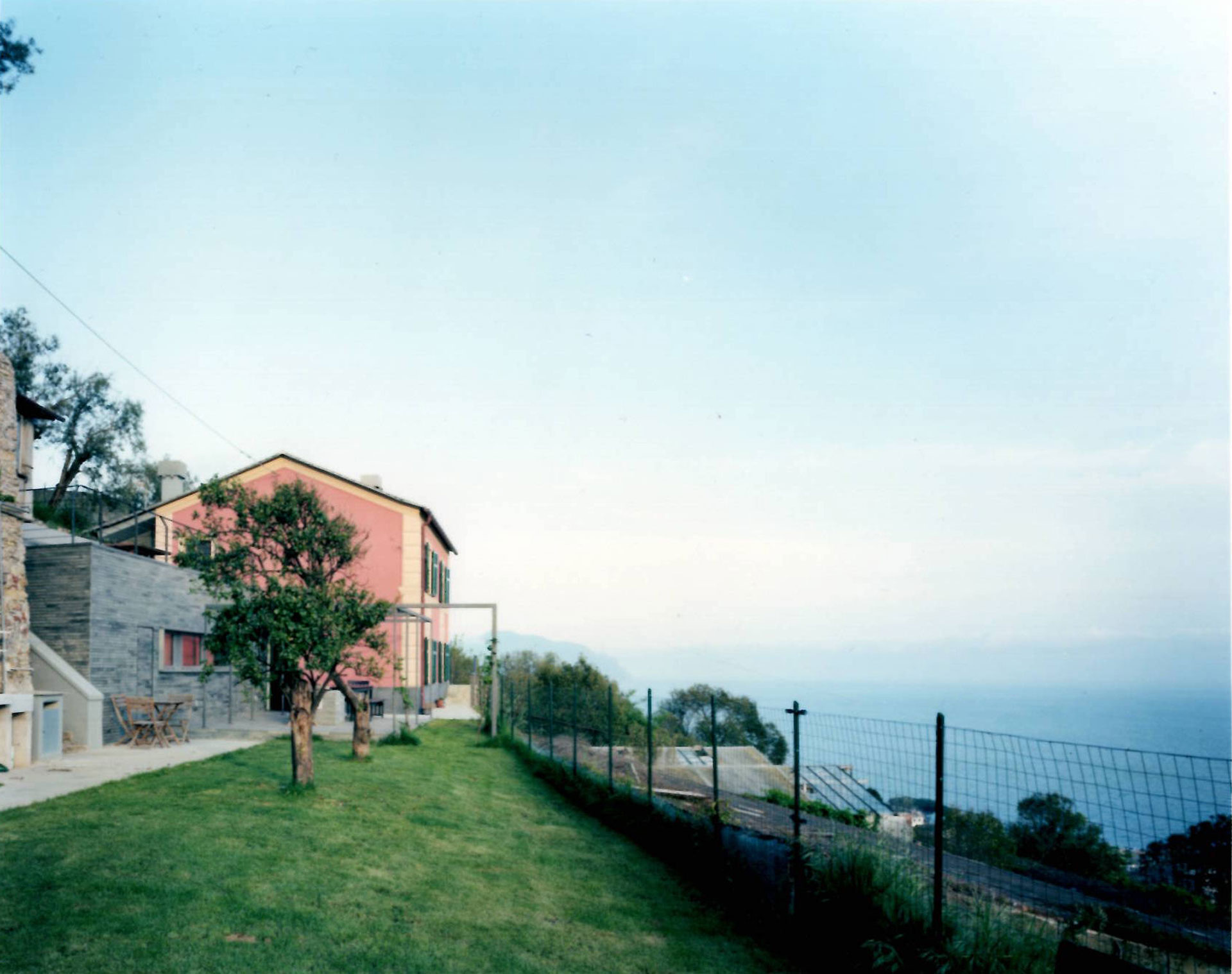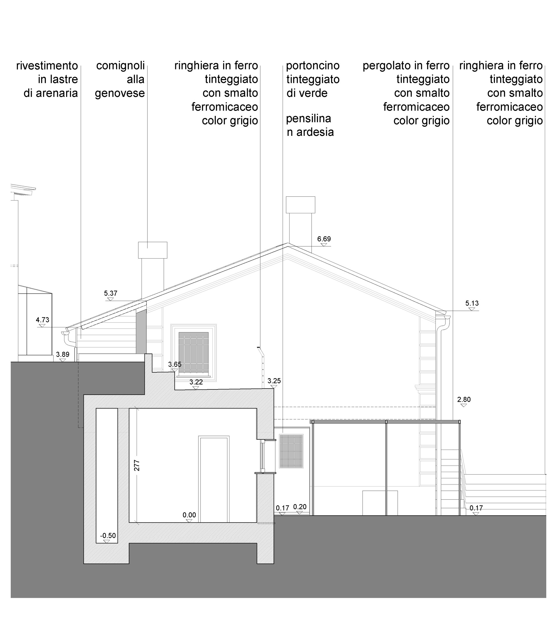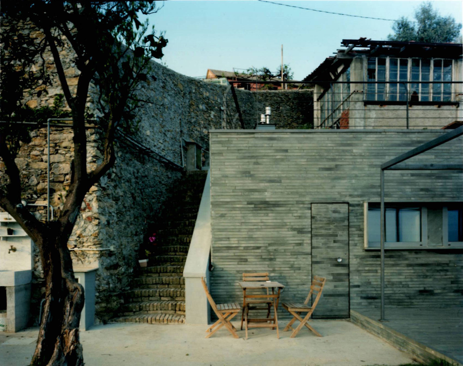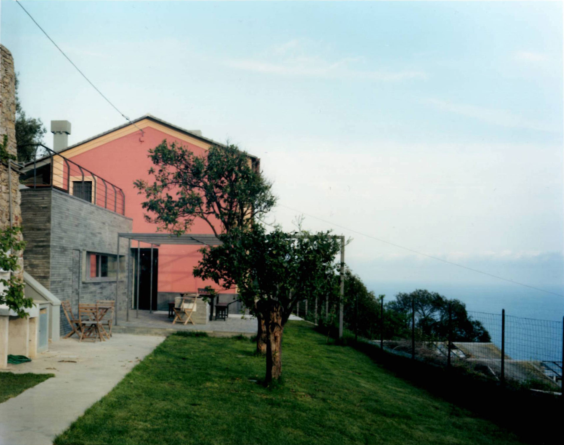 Nell’interpretazione del sistema dei terrazzamenti l’intervento appartiene ad una logica topografica piuttosto che a quella tettonica di un tradizionale corpo di fabbrica. La visibilità dei nuovi locali infatti è integrata all’andamento della fascia all’interno del giardino murato e costituisce un “muro abitato”, rivestito da una tessitura orizzontale di listelli lapidei, in cui una cornice della stessa pietra arenaria definisce una bucatura a nastro sull’orizzonte marino; la visuale di scorcio dall’esterno, mette in evidenza la continuità prospettica del muro di confine della creuza con il nuovo muro della fascia abitata che termina scivolando dentro la soglia della porta d’ingresso della parte del corpo di fabbrica preesistente, in un rapporto analogo a quello che, tradizionalmente, istituisce il muro di contenimento terrazzato con un volume edificato.