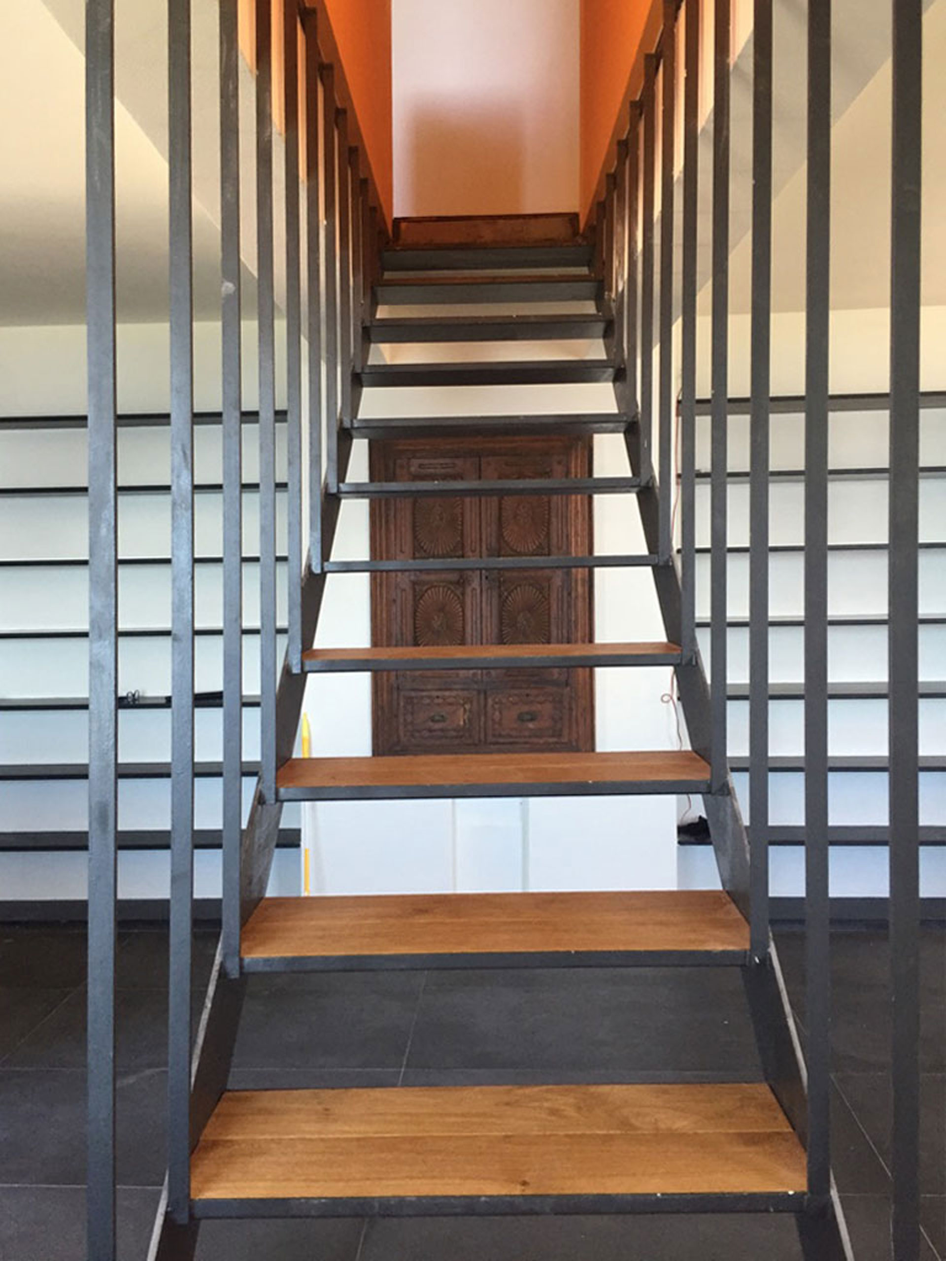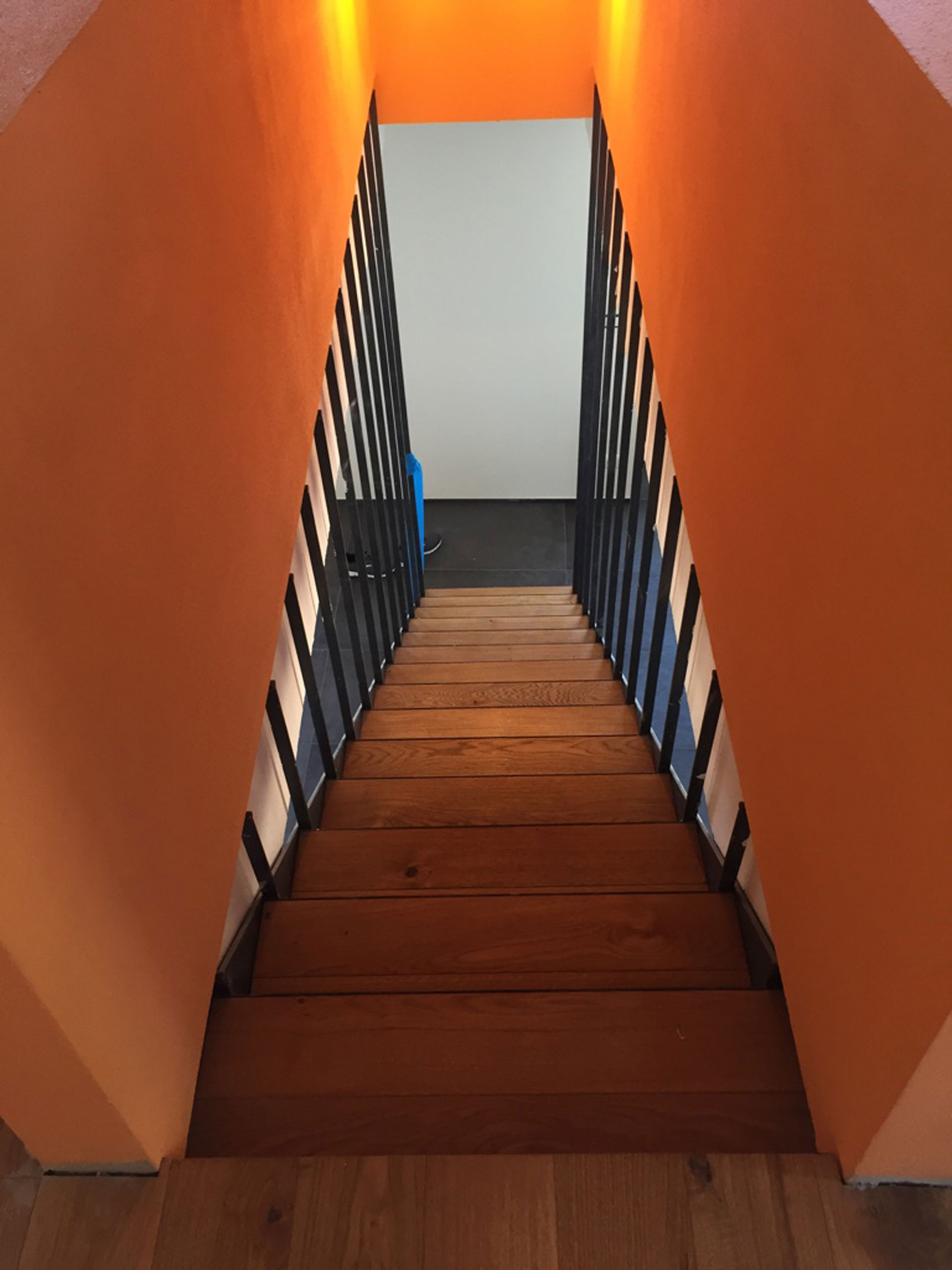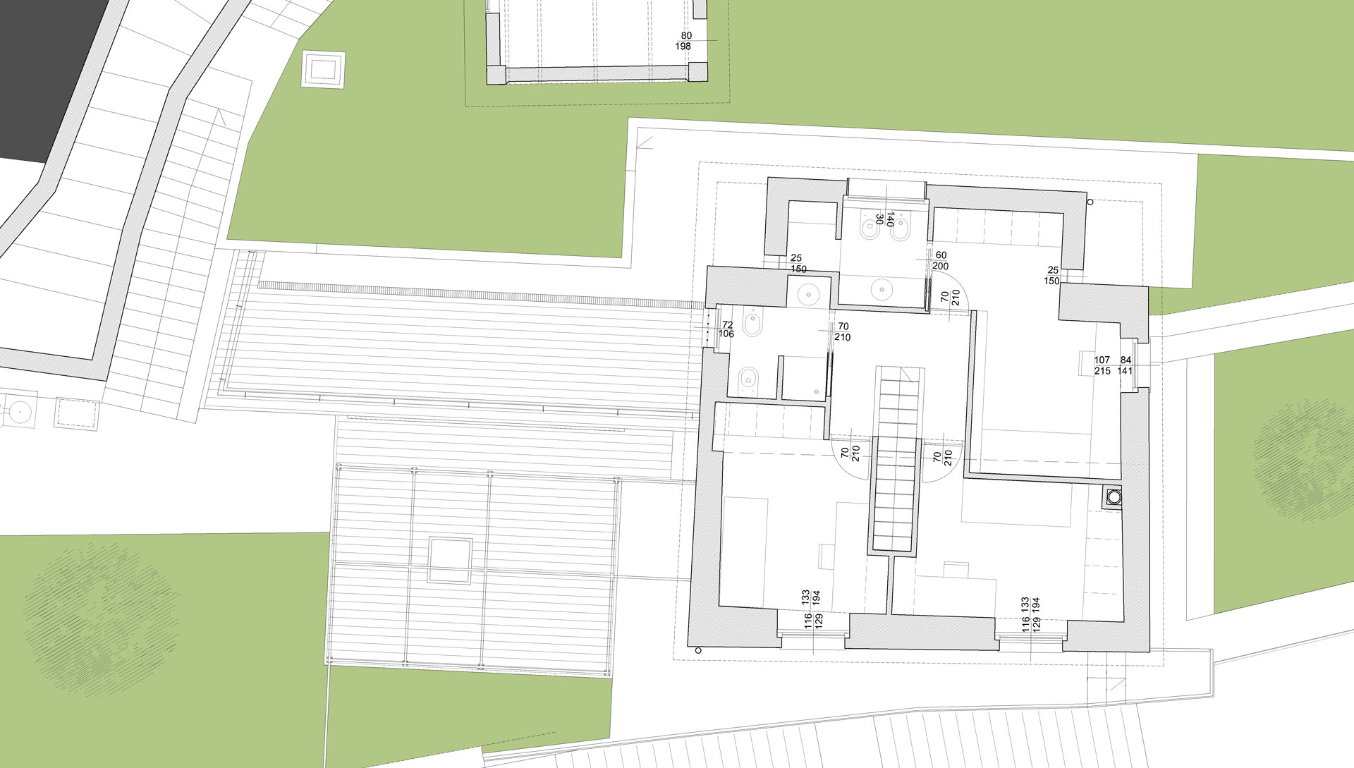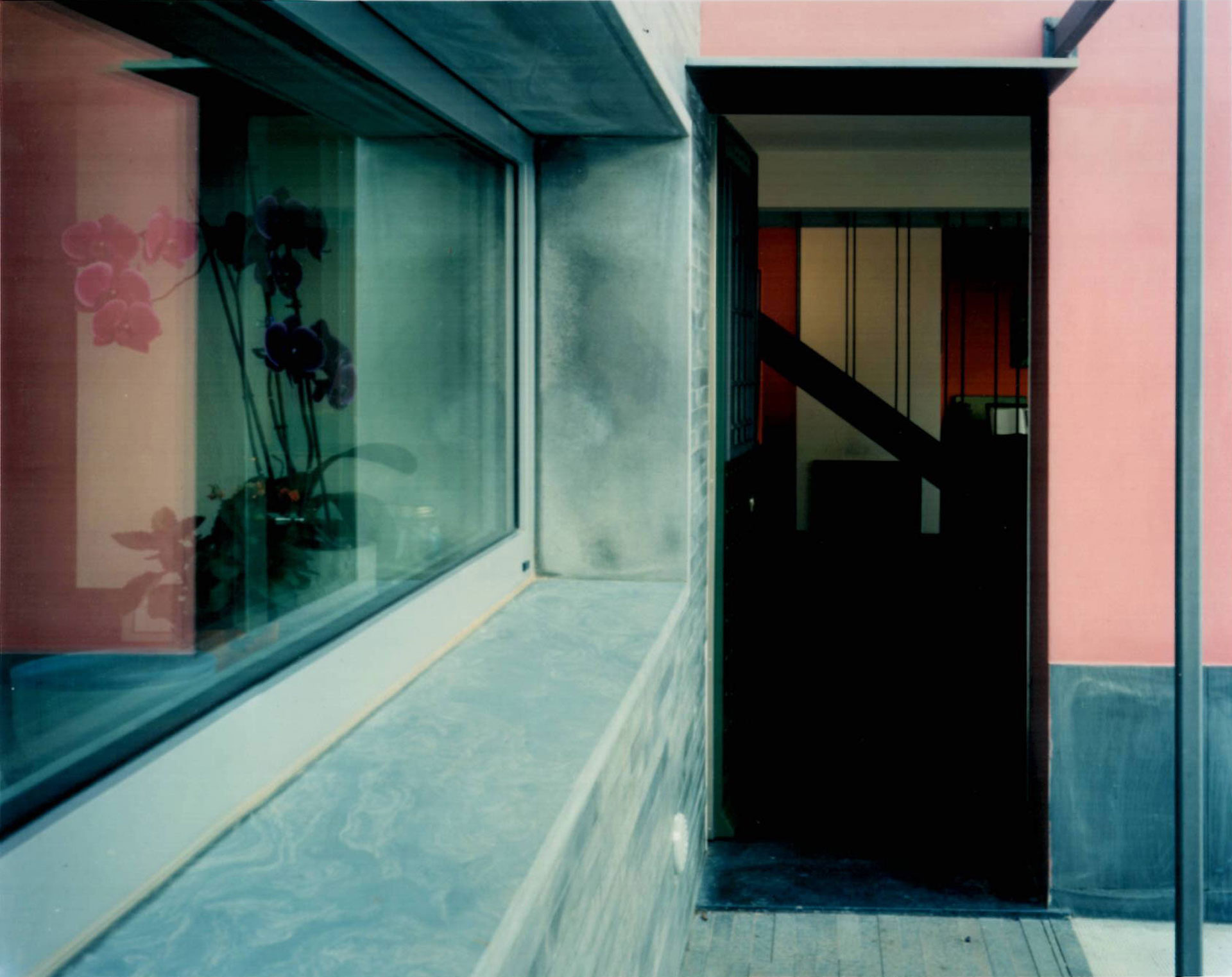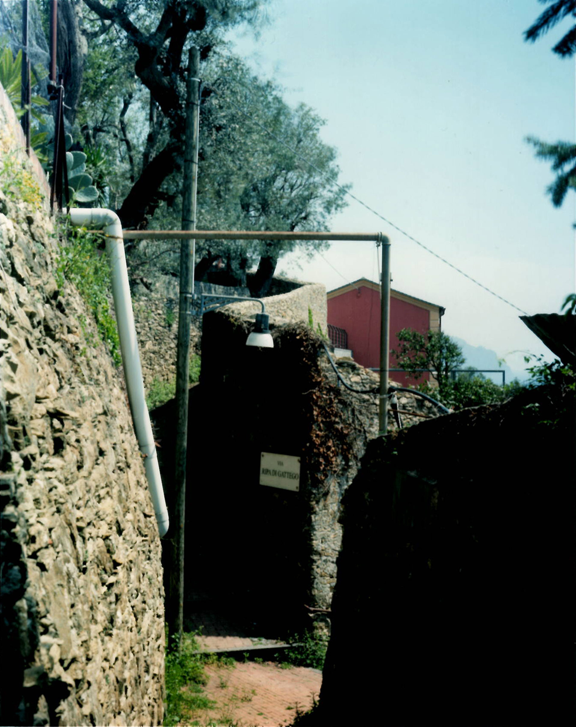 Nell’interpretazione del sistema dei terrazzamenti l’intervento appartiene ad una logica topografica piuttosto che a quella tettonica di un tradizionale corpo di fabbrica. La visibilità dei nuovi locali infatti è integrata all’andamento della fascia all’interno del giardino murato e costituisce un “muro abitato”, rivestito da una tessitura orizzontale di listelli lapidei, in cui una cornice della stessa pietra arenaria definisce una bucatura a nastro sull’orizzonte marino; la visuale di scorcio dall’esterno, mette in evidenza la continuità prospettica del muro di confine della creuza con il nuovo muro della fascia abitata che termina scivolando dentro la soglia della porta d’ingresso della parte del corpo di fabbrica preesistente, in un rapporto analogo a quello che, tradizionalmente, istituisce il muro di contenimento terrazzato con un volume edificato.