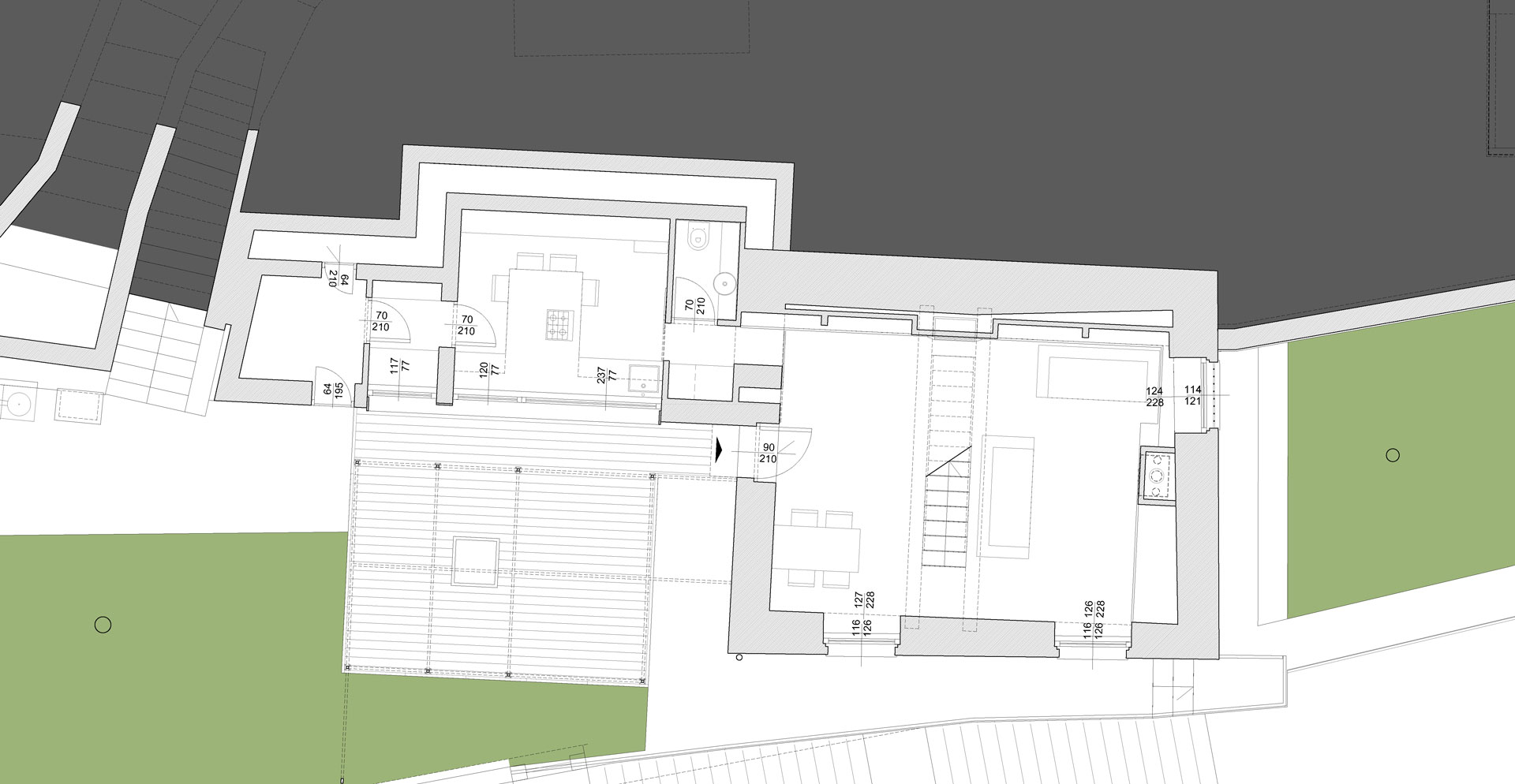 Il progetto di ristrutturazione edilizia riguarda una casa rurale che si sviluppa su due livelli, all’interno della sistemazione a fasce terrazzate di un giardino, immersa in un contesto ricco vegetazionale ad est, del tutto celata dai muri a secco delle creuze che delimitano i confini di proprietà. Il criterio che sta alla base della progettazione si esprime nel rapporto dialettico con il contesto storico ed ambientale, evitando ambiguità di lettura tra progetto e preesistenze. L’idea è quella di non andare ad agire sul profilo originario esterno della casa per salvaguardarne il carattere, e di sviluppare la parte di ampliamento possibile attraverso una soluzione spaziale parzialmente ipogea, che ospita la cucina e un locale di servizio.